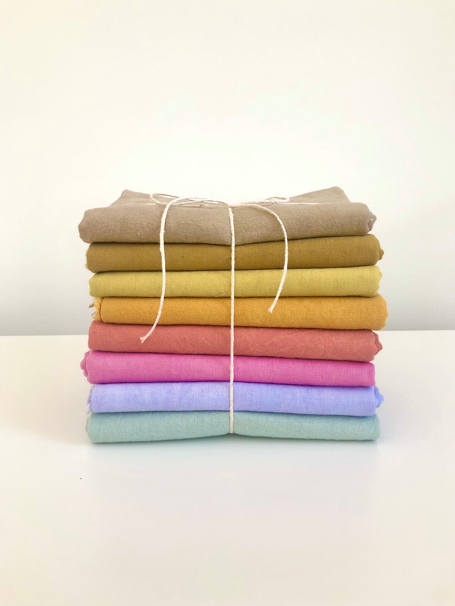 All fabric is prewashed cotton linen dyed with mx fiber reactive dye. The fabric is a bit heavier than traditional quilting cottons and tends to stretch a little more as well.