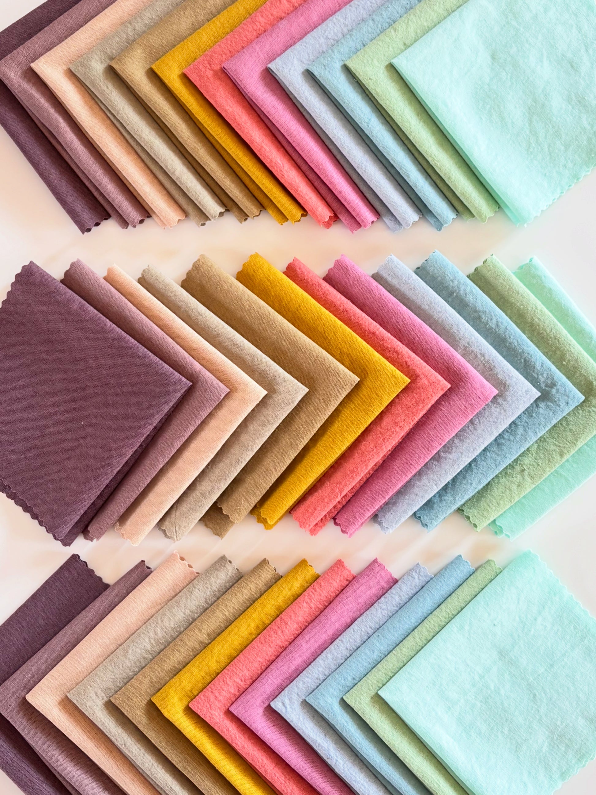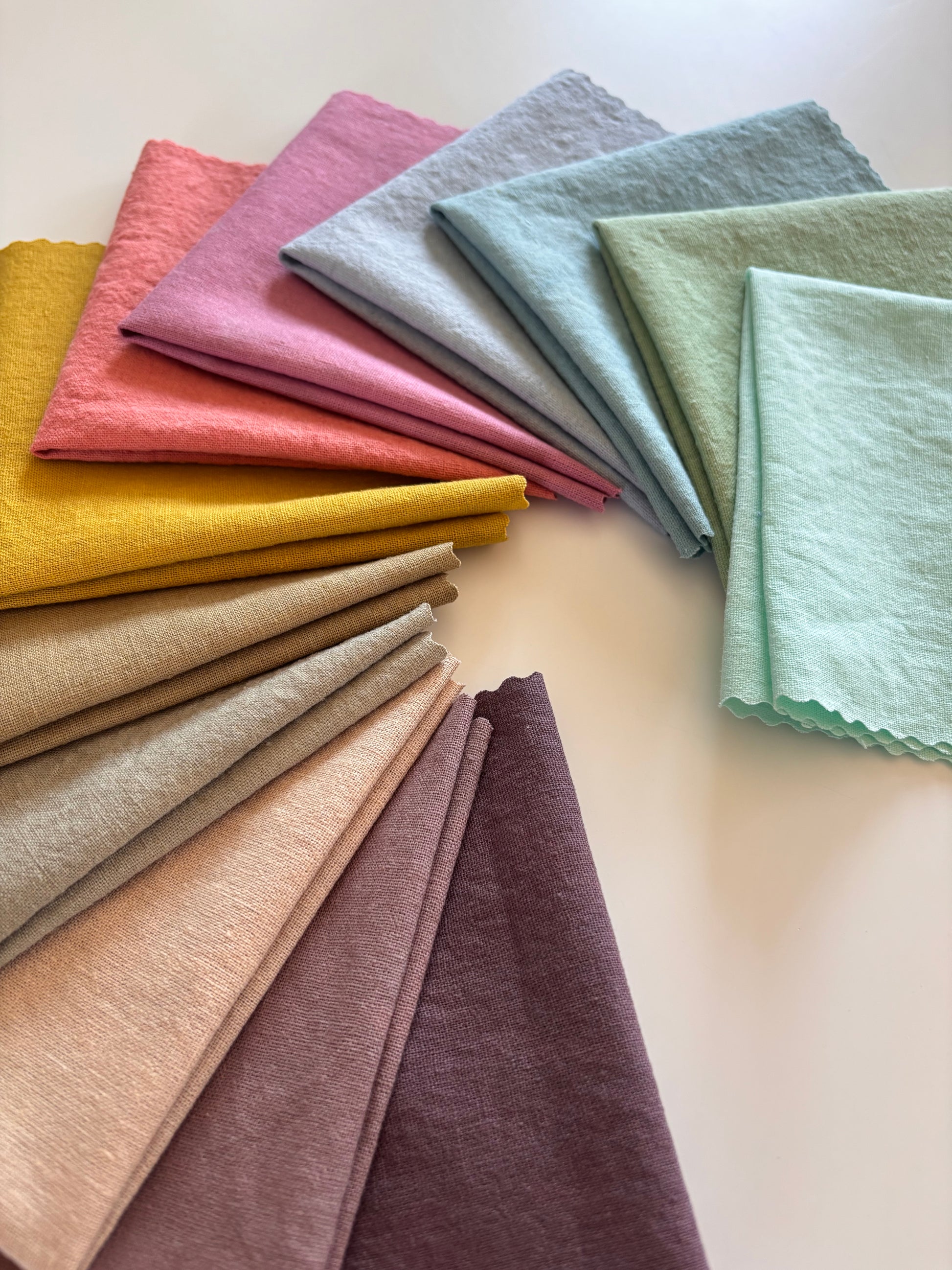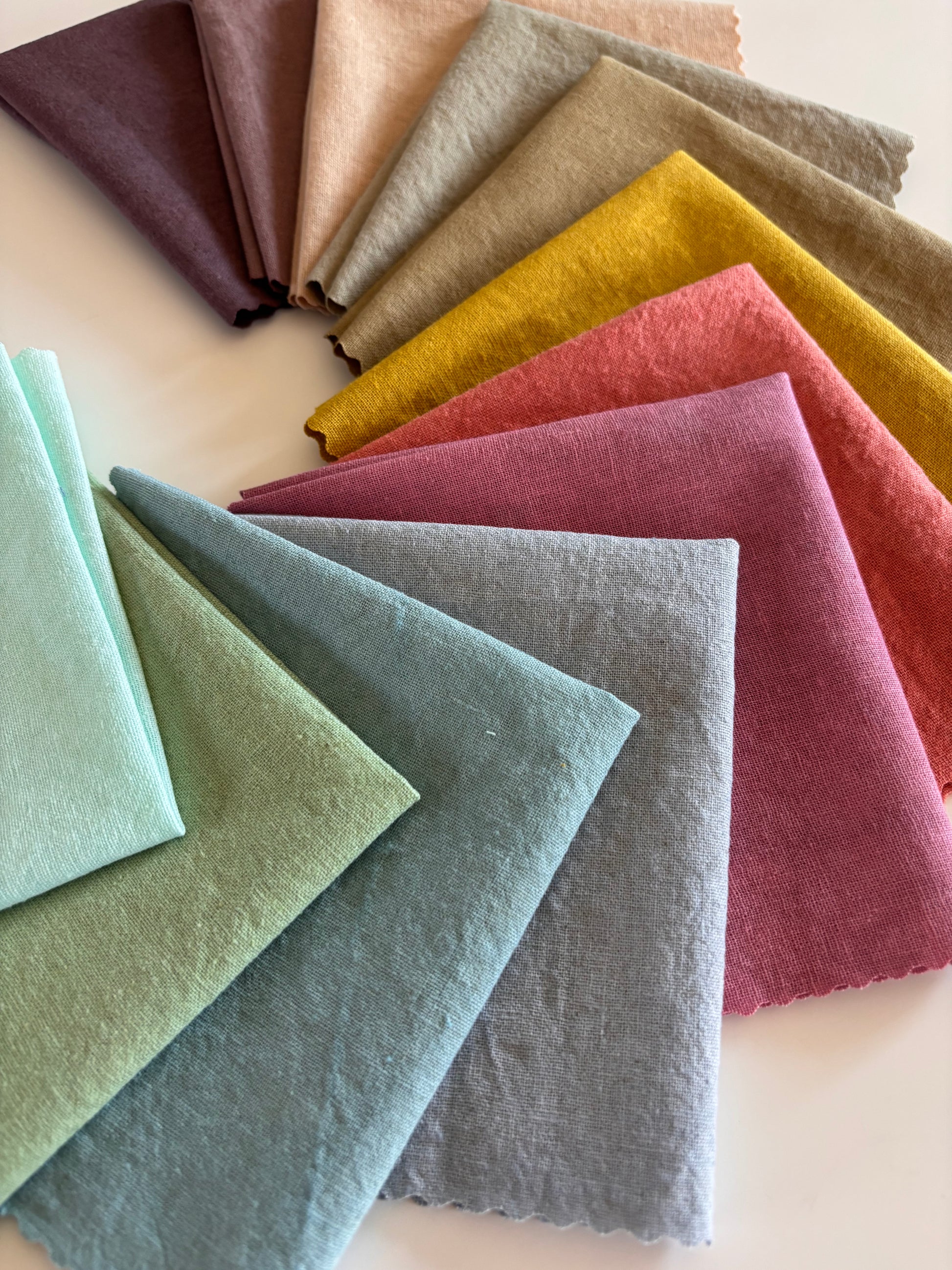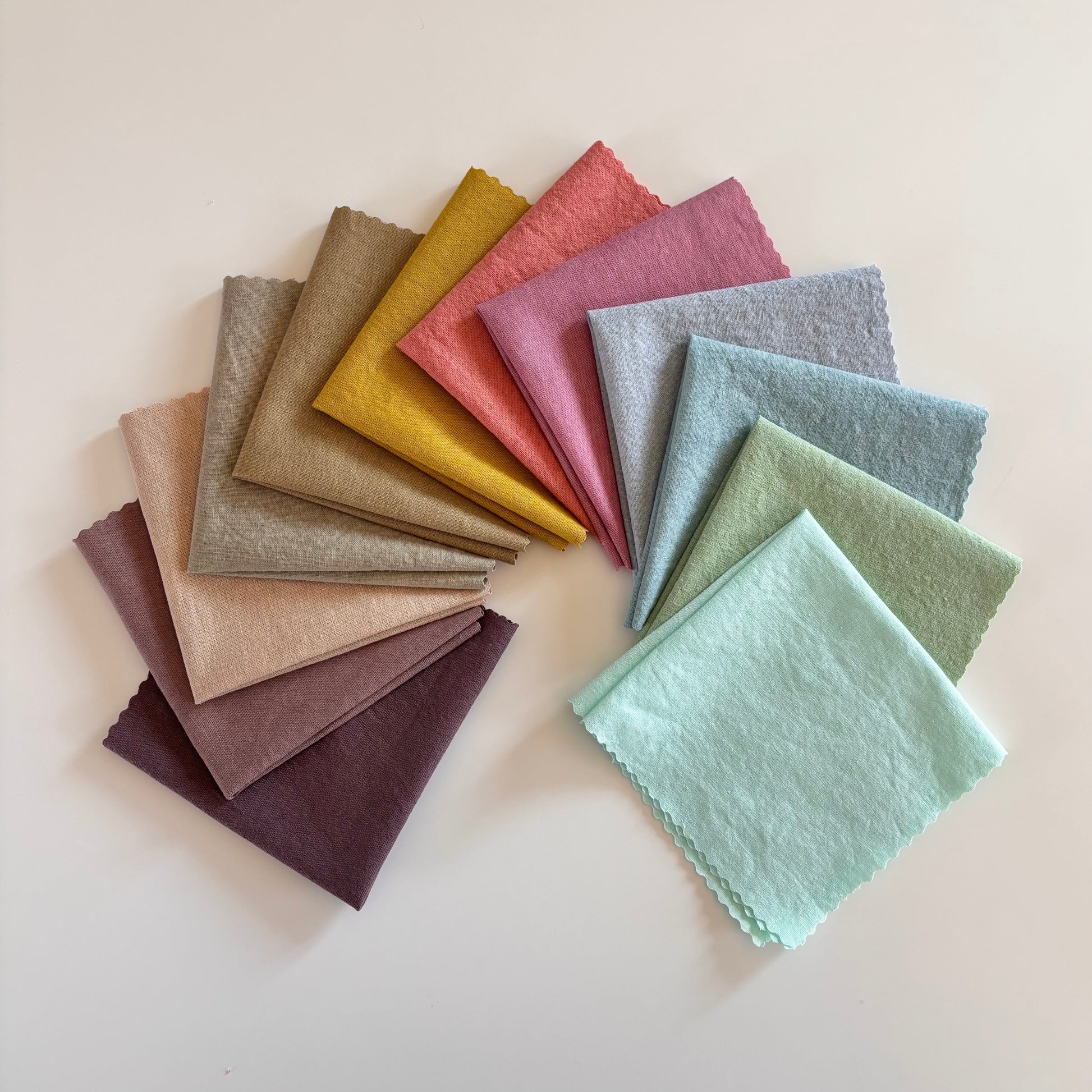 Twelve specially picked hand dyed 10ish" charm squares! Each piece is approximately 10" with a little extra on some.