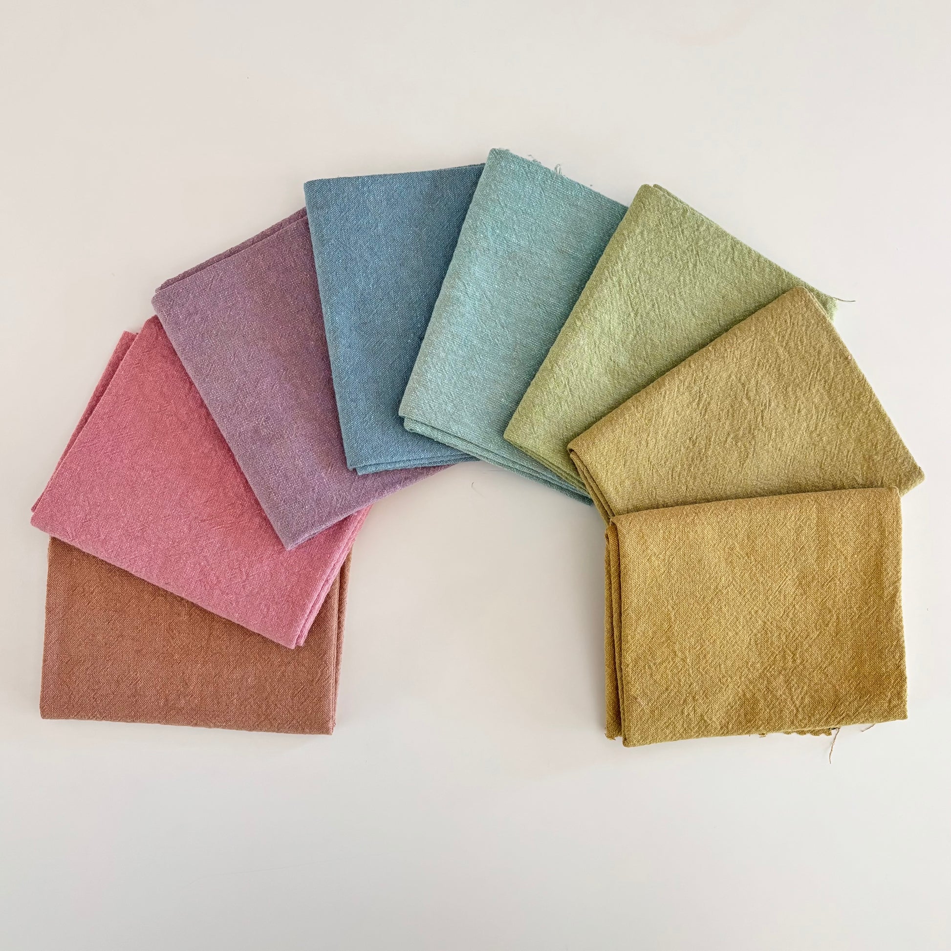 Eight specially picked hand dyed fat quarters! This Rainbow is dyed with all yarn dyed Essex linen. Each piece is approximately 18" x 22"
